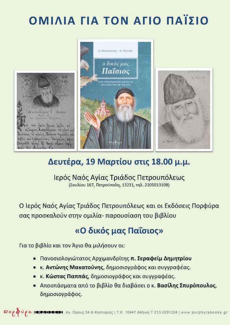 O Ι.Ν. Αγίας Τριάδος Πετρουπόλεως και οι Εκδόσεις Πορφύρα σας προσκαλούν στην ομιλία-παρουσίαση του βιβλίου με τίτλο: «Ο δικός μας Παΐσιος».