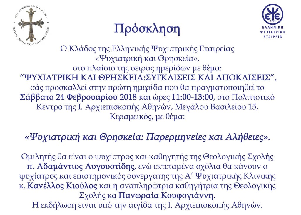 Η ημερίδα πραγματοποιήθηκε το Σάββατο 24 Φεβρουαρίου 2018 στο Πολιτιστικό Kέντρο της Αρχιεπισκοπής Αθηνών, Μεγάλου Βασιλείου 15, στον Κεραμεικό, (11:00-13:00), και είχε θέμα «Ψυχιατρική και Θρησκεία: Παρερμηνείες και Αλήθειες».