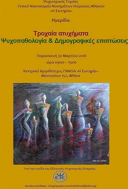 Ο Ψυχιατρικός Τομέας του Γενικού Νοσοκομείου Νοσημάτων Θώρακος Αθηνών «Η Σωτηρία», στο πλαίσιο των εκπαιδευτικών προγραμμάτων που εκπονεί διοργάνωσε την επιστημονική ημερίδα με θέμα: «Τροχαία ατυχήματα: Ο ρόλος της ψυχοπαθολογίας και οι δημογραφικές επιπτώσεις τους», η οποία πραγματοποιήθηκε την Παρασκευή 30 Μαρτίου (ώρα 09:00 – 15:00) και υπό την αιγίδα της Ελληνικής Ψυχιατρικής Εταιρείας.