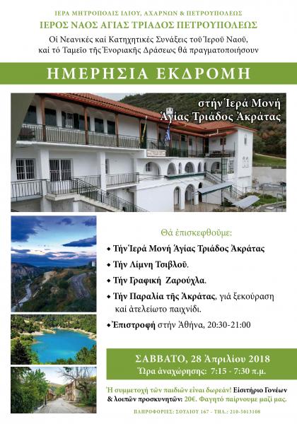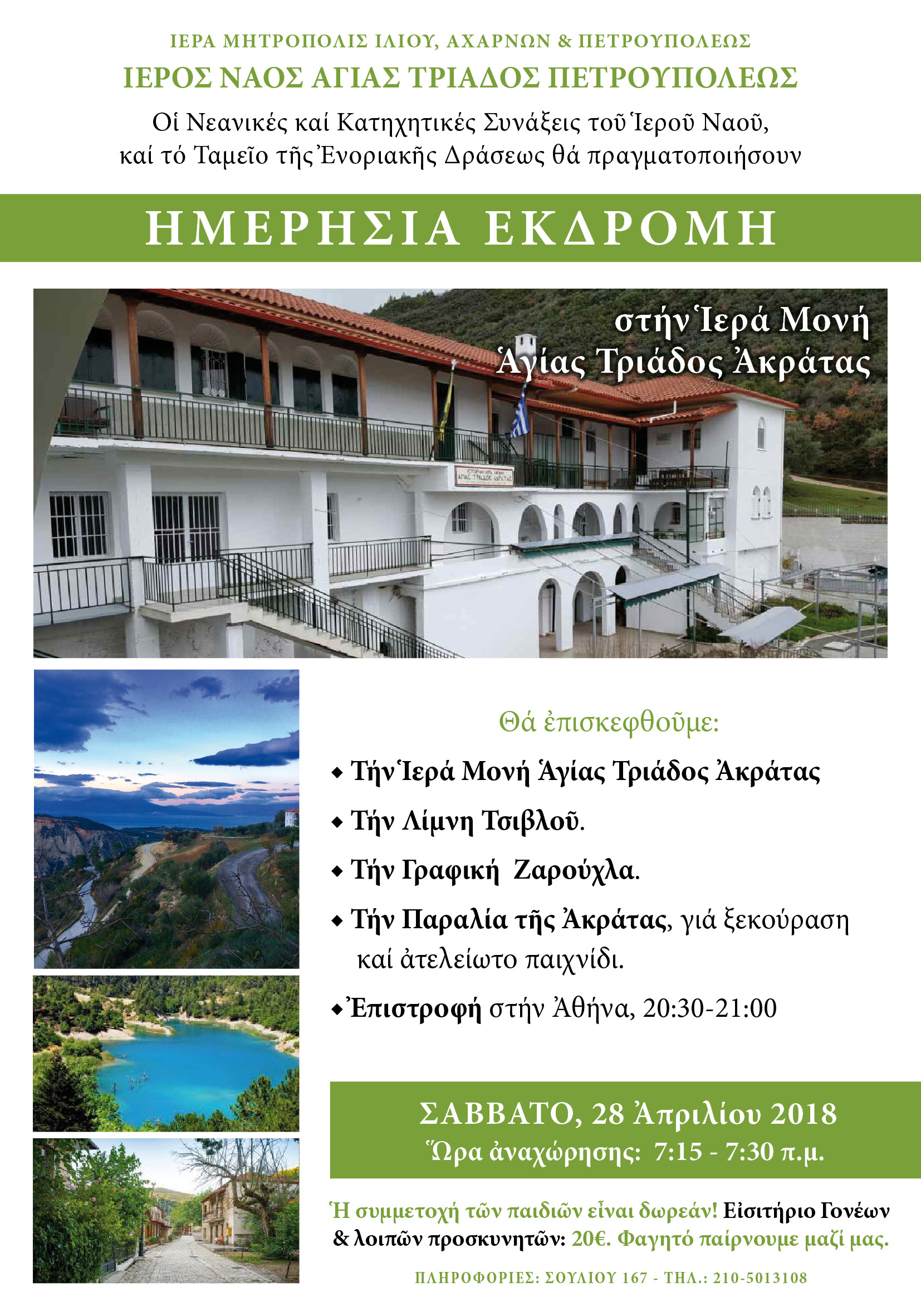 Οι νεανικές και κατηχητικές συνάξεις του Ι.Ν. Αγ. Τριάδας Πετρουπόλεως και το Ταμείο Ενοριακής Δράσεως θα πραγματοποιήσουν ημερήσια εκδρομή στην Ι.Μ. Αγίας Τριάδος Ακράτας.