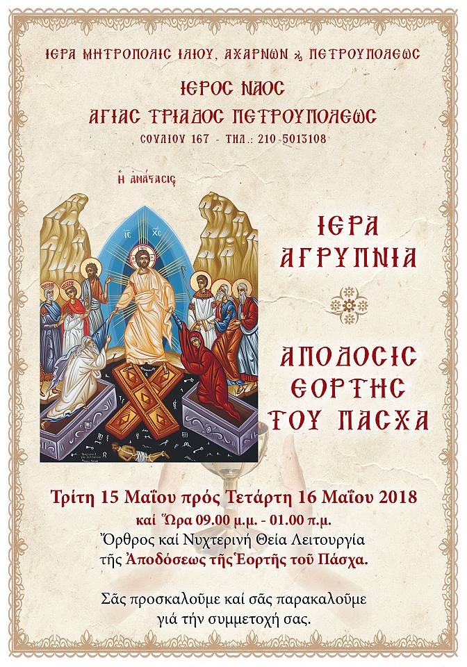 Την Τρίτη 15 Μαΐου προς Τετάρτη 16 Μαΐου 2018, και από 9 μ.μ. ως 1 π.μ., θα τελεστεί στον Ι.Ν. Αγ. Τριάδας Πετρουπόλεως ο όρθρος και νυχτερινή Θεία Λειτουργία της Αποδόσεως της εορτής του Πάσχα.