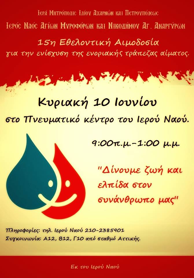 Την Κυριακή 10 Ιουνίου 2018, στο Πνευματικό Κέντρο του Ι.Ν. Αγίων Μυροφόρων και Νικοδήμου Δήμου Αγίων Αναργύρων, θα πραγματοποιηθεί η 15η εθελοντική αιμοδοσία, για την ενίσχυση της ενοριακής τράπεζας αίματος.