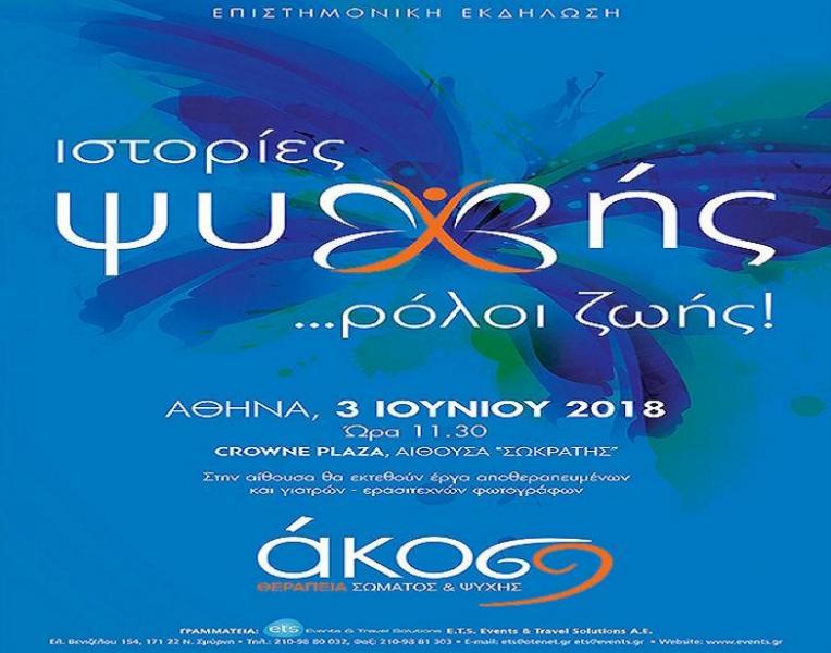 H επιστημονική μη κερδοσκοπική εταιρία ΑΚΟΣ: Καρκίνος. Θεραπεία σώματος και ψυχής  πραγματοποίησε την Επιστημονική Ημερίδα με θέμα «Ημερίδα Κοινού: Ιστορίες ψυχής… Ρόλοι ζωής» Η εκδήλωση της ΑΚΟΣ έλαβε χώρα  την Κυριακή 3 Ιουνίου 2018, στις 12.00 το μεσημέρι στο ξενοδοχείο Crown Plaza, στην Αθήνα.
