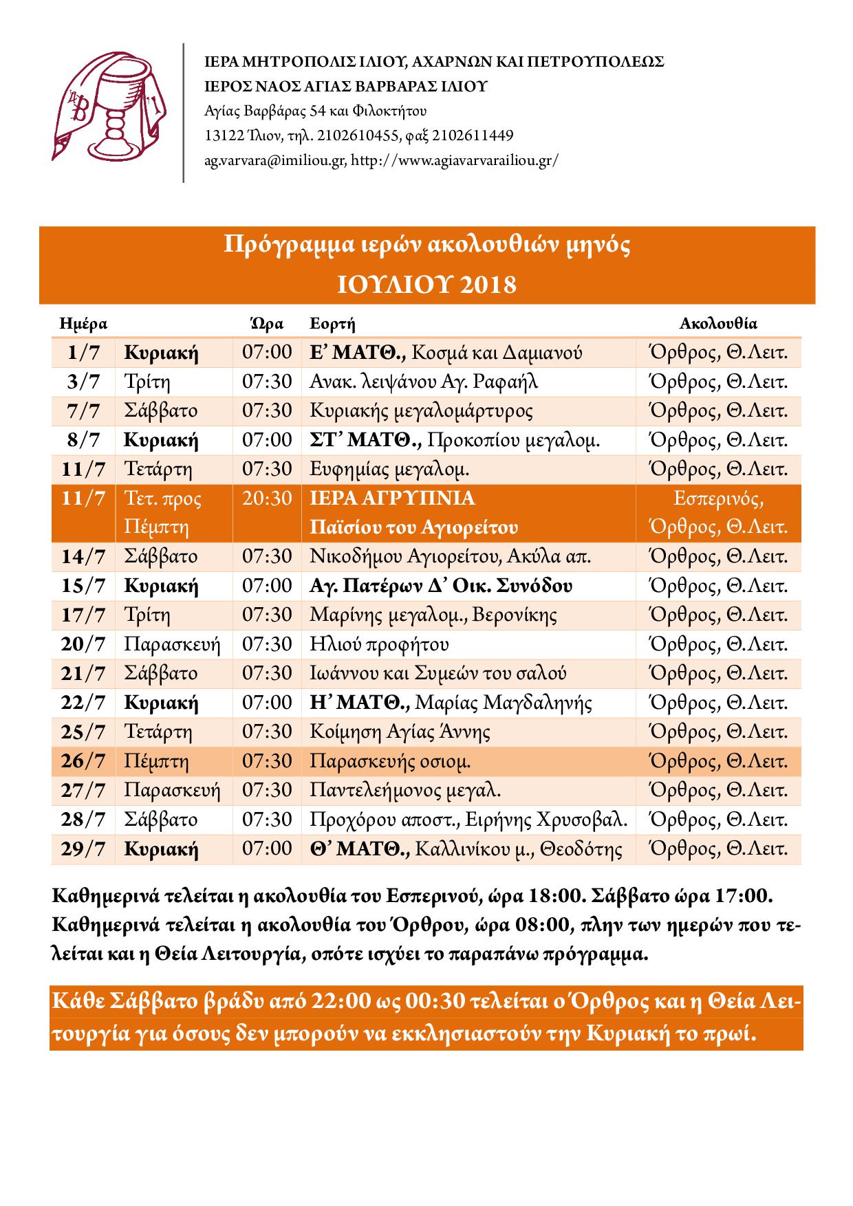 Πρόγραμμα ακολουθιών Ιουλίου 2018