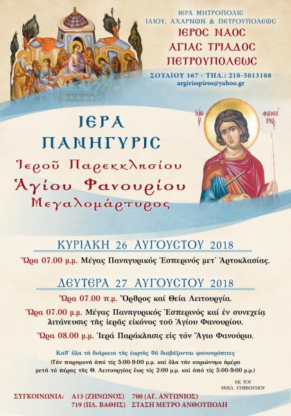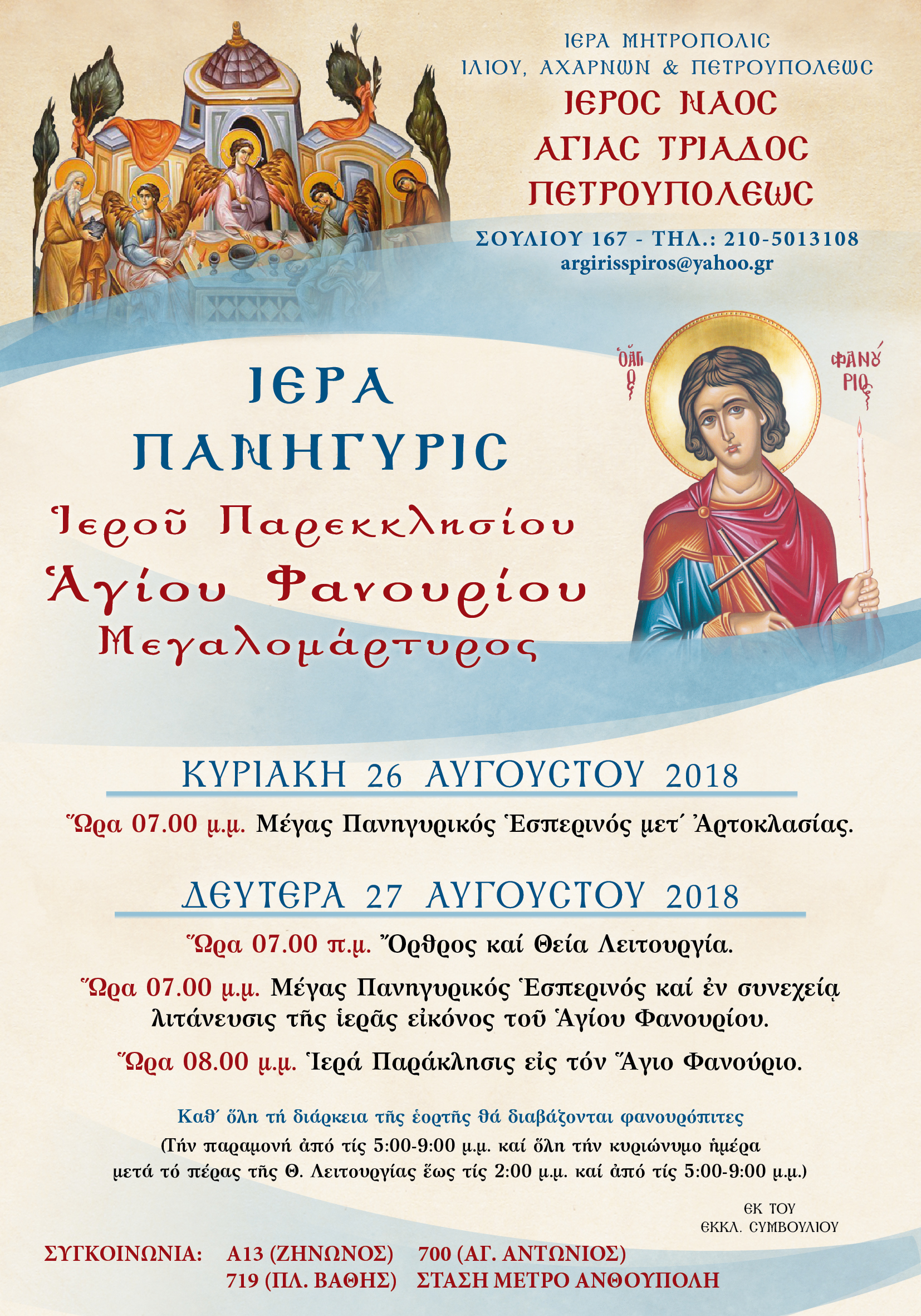 Ο Ιερός Ναός Αγίας Τριάδος Πετρουπόλεως πανηγυρίζει τη μνήμη του Αγίου μεγαλομάρτυρος Φανουρίου, στο παρεκκλήσιο του Αγίου, στο υπόγειο του ναού.