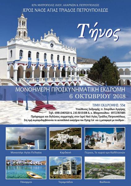 Η ενορία της Αγίας Τριάδας Πετρουπόλεως πραγματοποιεί μονοήμερη προσκυνηματική εκδρομή στη νήσο της Τήνου, στις 6 Οκτωβρίου 2018.