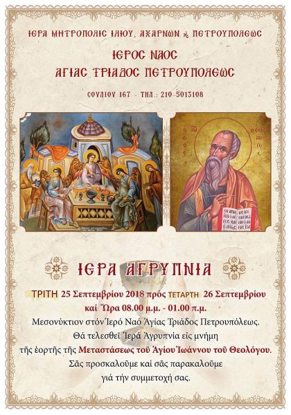 Ιερά αγρυπνία θα τελεστεί στον Ι.Ν. Αγ. Τριάδας Πετρουπόλεως την Τρίτη 25 Σεπτεμβρίου 2018 και ώρα 8 μ.μ, ως περίπου τη 1 τα ξημερώματα της Τετάρτης 26 Σεπτεμβρίου, επί τη μεταστάσει του Αγίου Ιωάννου του Θεολόγου.
