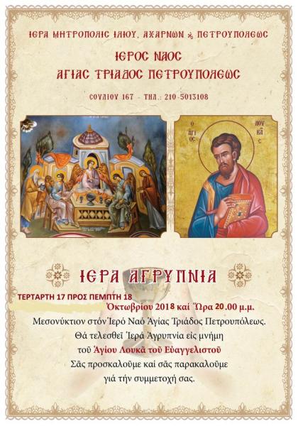 Ιερά Αγρυπνία θα τελεστεί στον Ι. Ν. Αγ. Τριάδας Πετρουπόλεως επί τη μνήμη του Αγίου Αποστόλου και Ευαγγελιστού Λουκά.