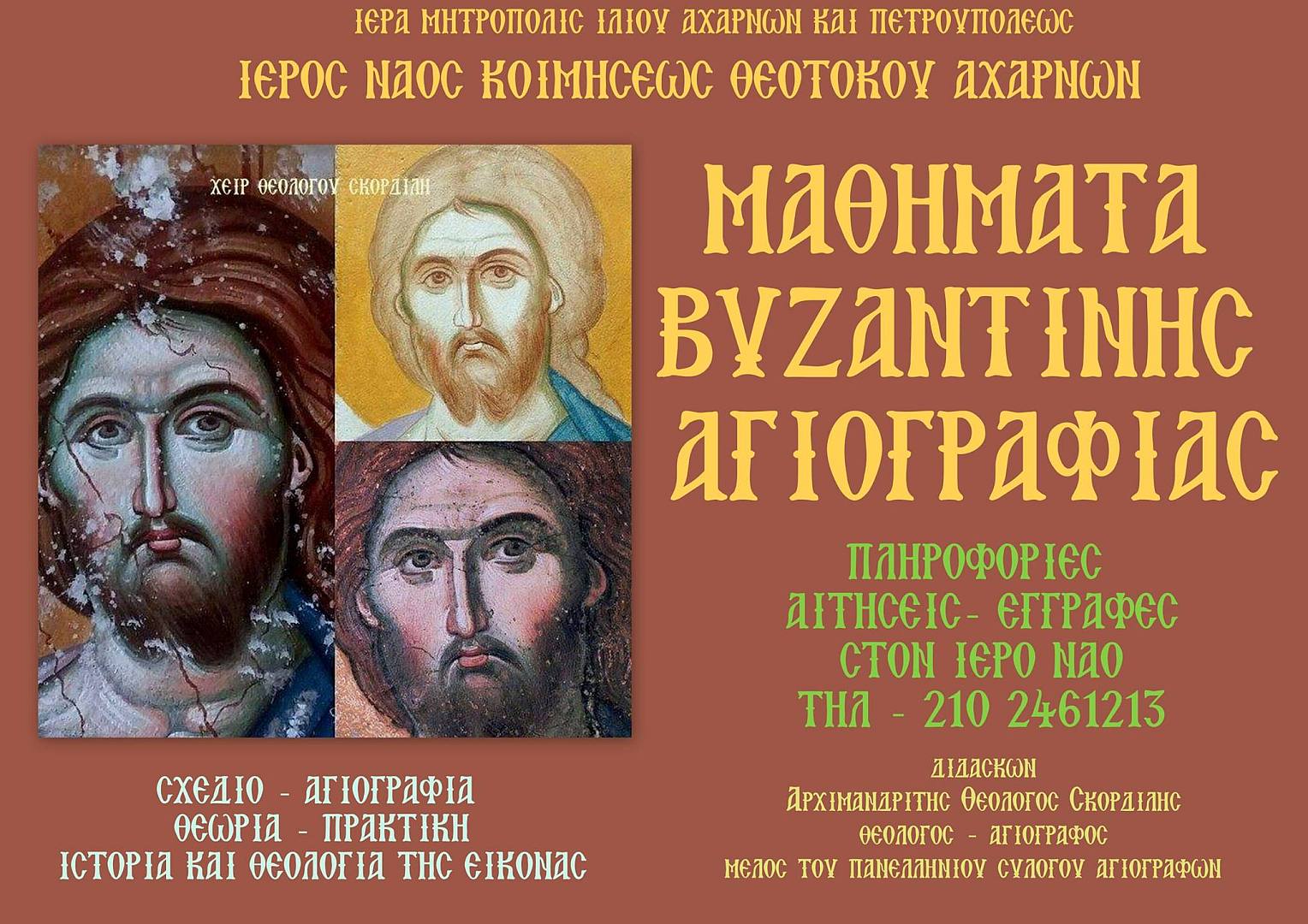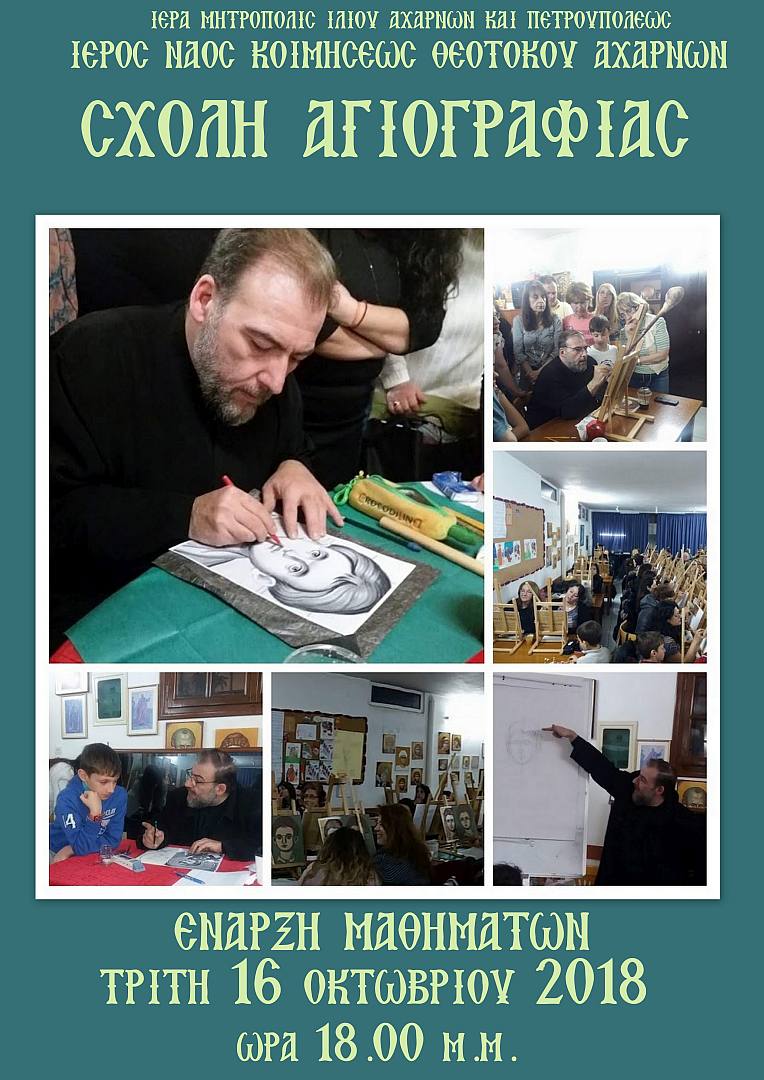 Την Τρίτη 16 Οκτωβρίου 2018 και ώρα 18.00 αρχίζουν τα Μαθήματα της σχολής Αγιογραφίας στον Ιερό Ναό Κοιμήσεως Θεοτόκου Αχαρνών.