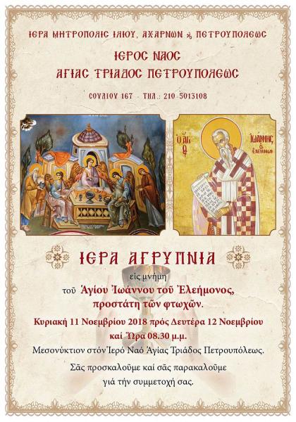Ιερά αγρυπνία επί τη μνήμη του Αγίου Ιωάννου του Ελεήμονος, προστάτη των φτωχών, θα πραγματοποιηθεί στον Ιερό Ναό Αγίας Τριάδας Πετρουπόλεως, την Κυριακή 11 Νοεμβρίου 2018 και ώρα 20:30.
