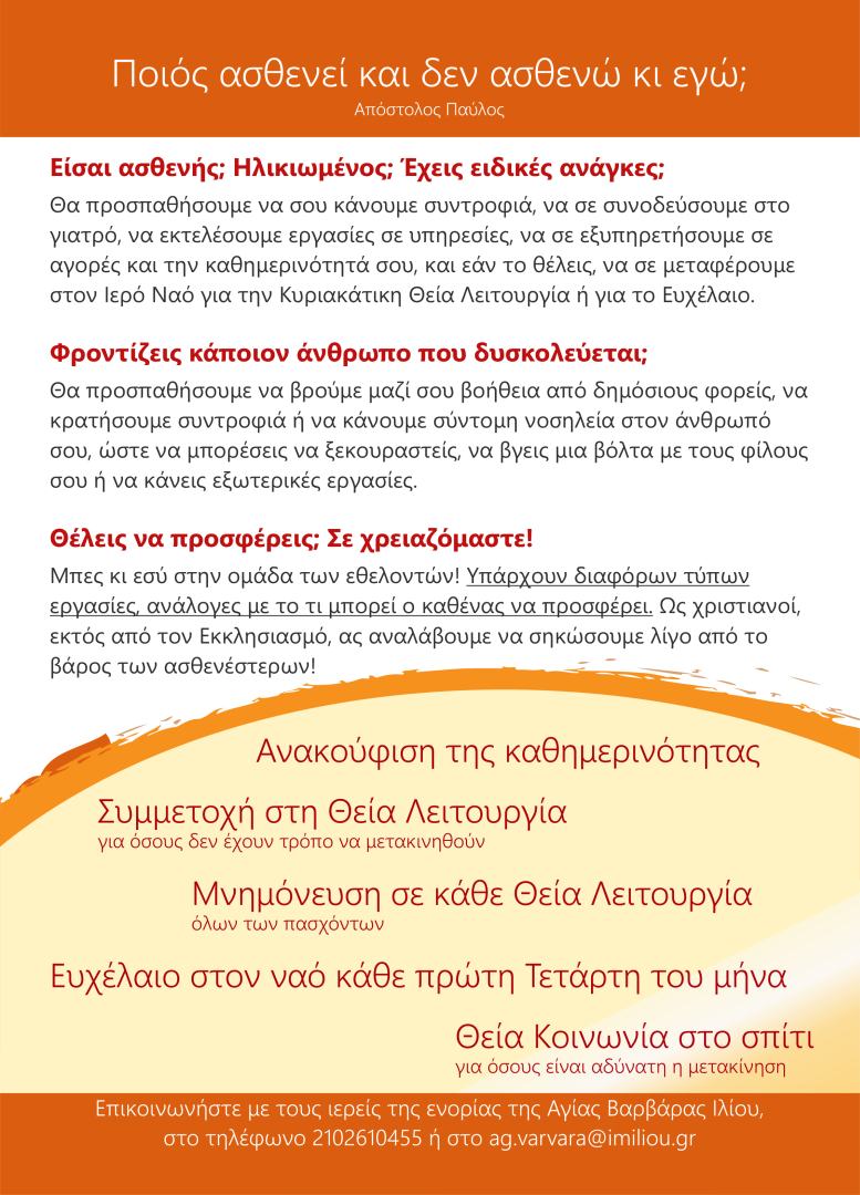 Θα προσπαθήσουμε να σου κάνουμε συντροφιά, να σε συνοδεύσουμε στο γιατρό, να εκτελέσουμε εργασίες σε υπηρεσίες, να σε εξυπηρετήσουμε σε αγορές και την καθημερινότητά σου, και εάν το θέλεις, να σε μεταφέρουμε στον Ιερό Ναό για την Κυριακάτικη Θεία Λειτουργία ή για το Ευχέλαιο.