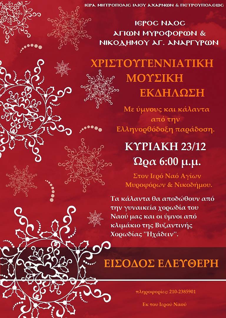 Ύμνους και κάλαντα από την ελληνορθόδοξη παράδοση θα περιλαμβάνει η χριστουγεννιάτικη μουσική εκδήλωση που θα πραγματοποιηθεί στον Ι.Ν. Αγίων Μυροφόρων και Νικοδήμου, Δήμου Αγ. Αναργύρων.