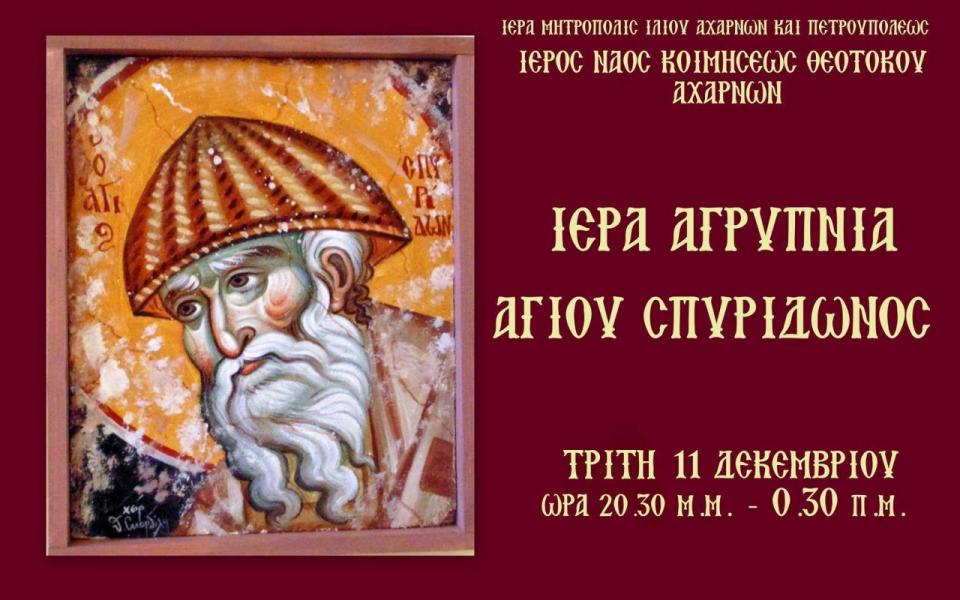 Την Τρίτη 11 Δεκεμβρίου 2018 και ώρα 20.30 μ.μ. - 00.30 π.μ., στον Ιερό Ναό Κοιμήσεως Θεοτόκου Αχαρνών θα τελεσθεί Ιερά Αγρυπνία επί τη μνήμη του εν Αγίοις Πατρός ημών Σπυρίδωνος Επισκόπου Τριμυθούντος του Θαυματουργού.
