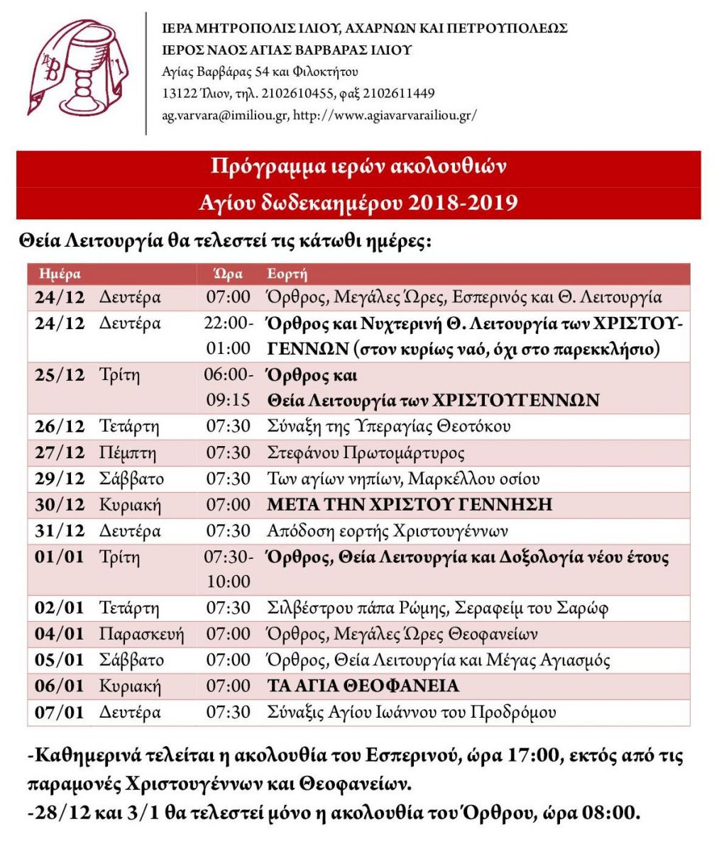Δείτε το πρόγραμμα ακολουθιών στον Ιερό Ναό Αγίας Βαρβάρα Ιλίου, κατά το άγιο δωδεκαήμερο 2018-2019.