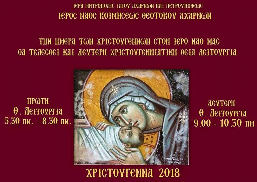 Την ημέρα των Χριστουγέννων, στον Ι.Ν. Κοιμήσεως Θεοτόκου Αχαρνών θα τελεστεί η Θεία Λειτουργία δύο φορές: