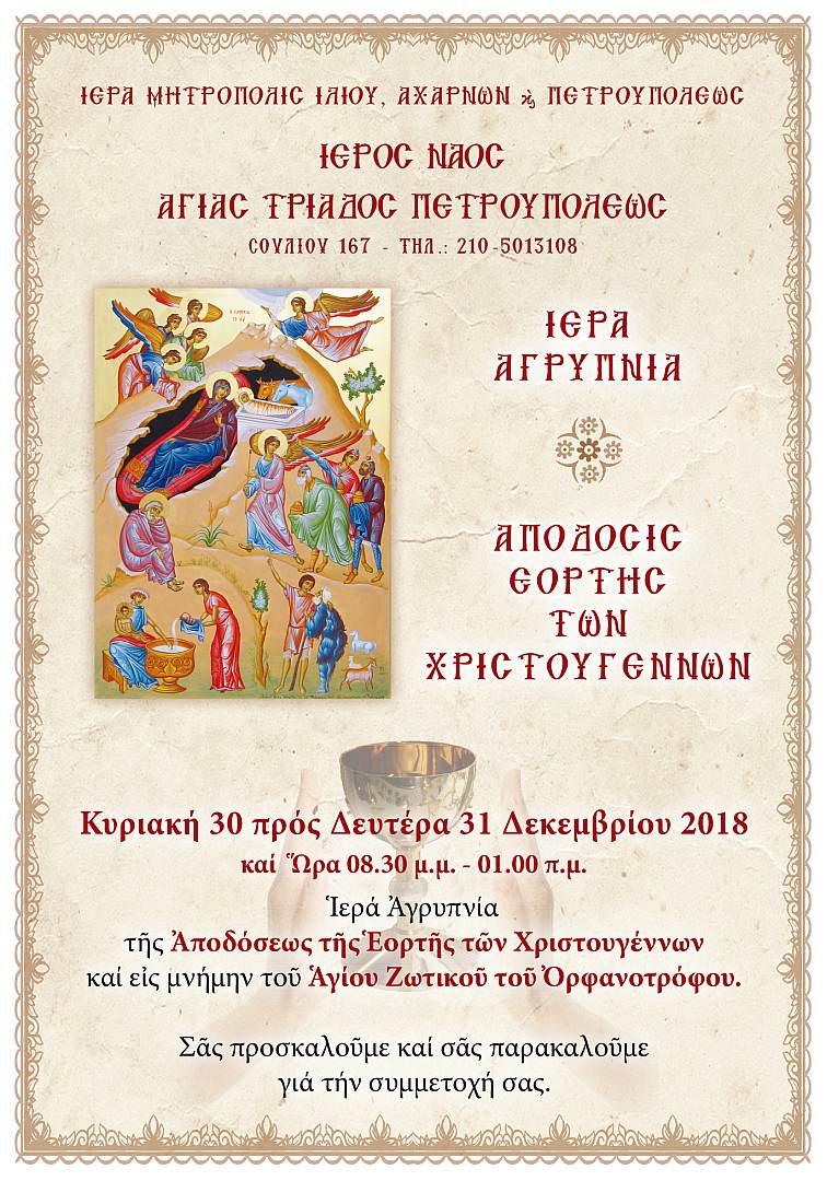 Αγρυπνία επί τη αποδόσει της εορτής των Χριστουγέννων και τη μνήμη του Αγίου Ζωτικού του Ορφανοτρόφου θα τελεστεί την Κυριακή 30 Δεκεμβρίου 2018 και ώρα 20:30-01:00, στον Ι.Ν. Αγίας Τριάδας Πετρουπόλεως.