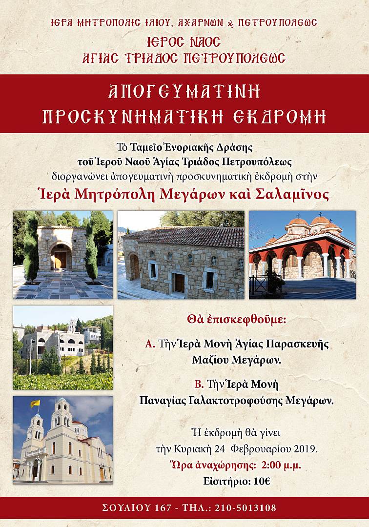 Το Ταμείο Ενοριακής Δράσης του Ιερού Ναού Αγίας Τριάδος Πετρουπόλεως διοργανώνει απογευματινή προσκυνηματική εκδρομή στην Ιερά Μητρόπολη Μεγάρων και Σαλαμίνος.