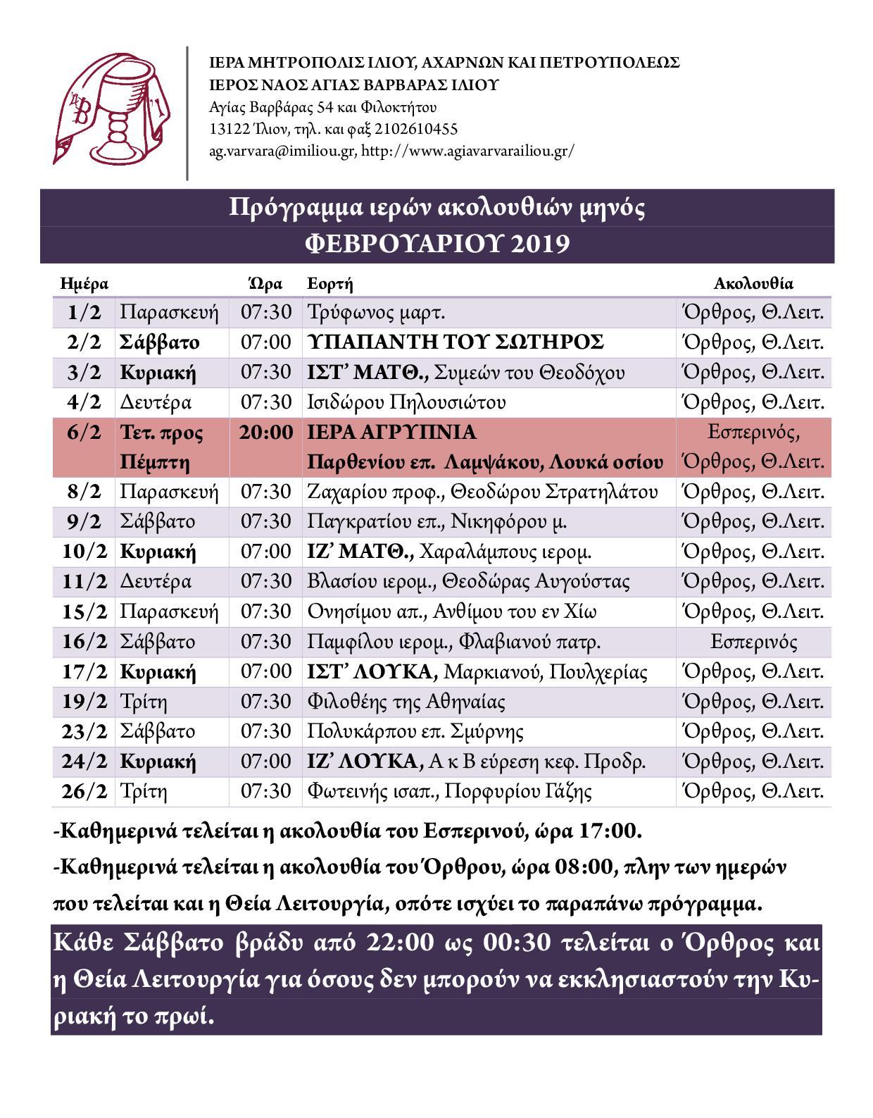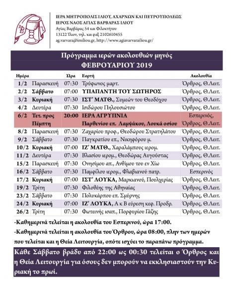 Δείτε το πρόγραμμα των ακολουθιών του Ι.Ν. Αγ. Βαρβάρας Ιλίου για το μήνα Φεβρουάριο 2019.