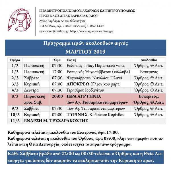 Δείτε το πρόγραμμα των ακολουθιών του Ι.Ν. Αγ. Βαρβάρας Ιλίου για το μήνα Μάρτιο 2019, μέχρι την έναρξη της Μεγάλης Τεσσαρακοστής.