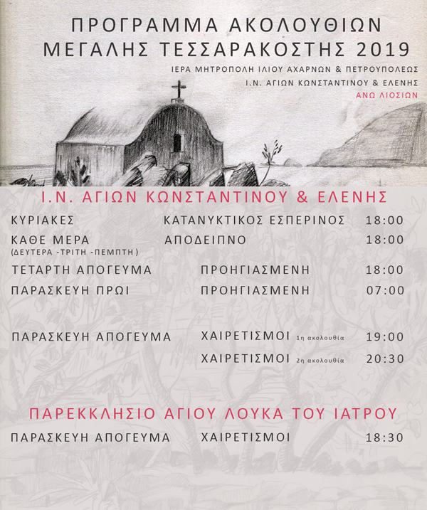 Δείτε το πρόγραμμα ακολουθιών κατά την περίοδο της Μεγάλης Τεσσαρακοστής 2019, στον Ιερό Ναό Αγίων Κωνσταντίνου και Ελένης Άνω Λιοσίων και στο Ιερό Παρεκκλήσιο του Αγίου Λουκά του ιατρού.