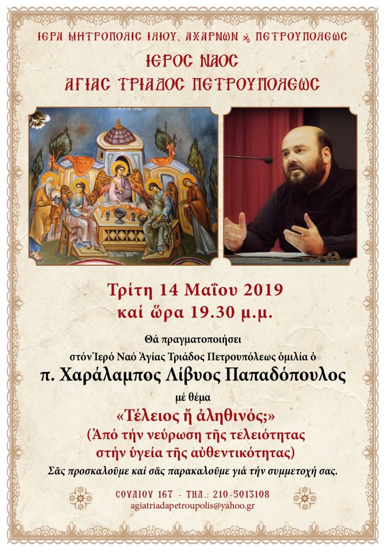 Την Τρίτη 14 Μαΐου 2019 και ώρα 19:30 θα πραγματοποιήσει στον Ιερό Ναό Αγίας Τριάδος Πετρουπόλεως ομιλία ο π. Χαράλαμπος Παπαδόπουλος (γνωστός ευρύτερα με το όνομα «π. Λίβυος»), με θέμα: