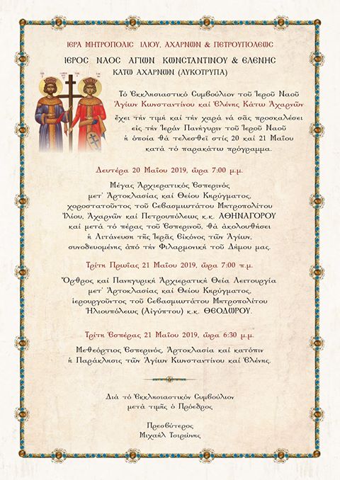 Το Εκκλησιαστικό Συμβούλιο του Ιερού Ναού Αγίων Κωνσταντίνου και Ελένης Κάτω Αχαρνών έχει την τιμή και τη χαρά να σας προσκαλέσει στην Ιερά Πανήγυρη του Ιερού Ναού, η οποία θα τελεσθεί στις 20 και 21 Μαΐου 2019, κατά το ακόλουθο πρόγραμμα: