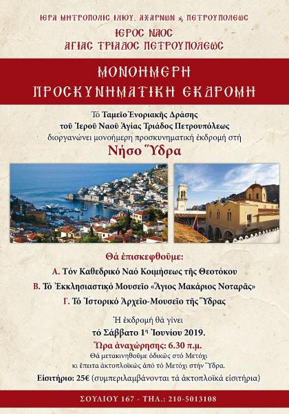 Το Ταμείο Ενοριακής Δράσης του Ιερού Ναού Αγίας Τριάδος Πετρουπόλεως διοργανώνει μονοήμερη προσκυνηματική εκδρομή στη νήσο Ύδρα.