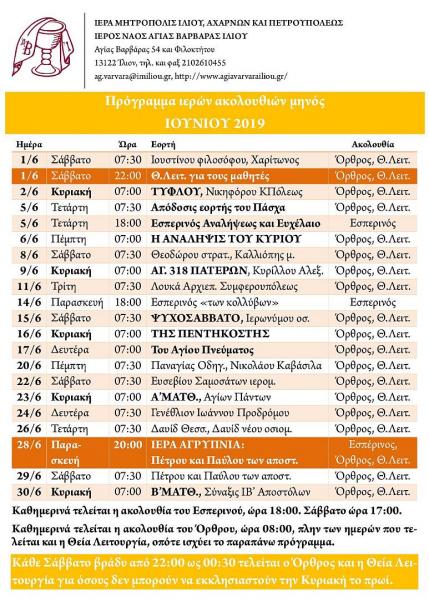Πρόγραμμα ακολουθιών Ιουνίου 2019