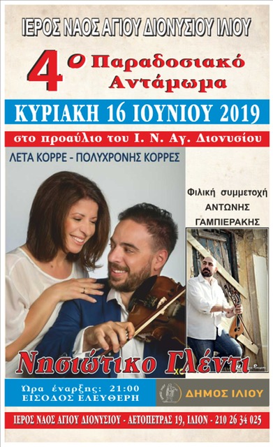 Με παραδοσιακή νησιώτικη μουσική και όχι μόνο θα πραγματοποιηθεί το 4ο παραδοσιακό αντάμωμα στο προαύλιο του Ιερού Ναού Αγίου Διονυσίου Ιλίου, την Κυριακή 16 Ιουνίου 2019, με ελεύθερη είσοδο και ώρα έναρξης 21:00.