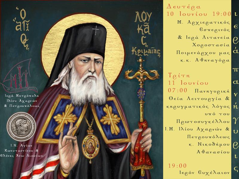 Απευθύνουμε πρόσκληση για τη συμμετοχή σας στις λειτουργικές εκδηλώσεις που θα πραγματοποιηθούν στο πανηγυρίζον Ιερό Παρεκκλήσιο Αγίου Λουκά επισκόπου Συμφερουπόλεως, στα Άνω Λιόσια.