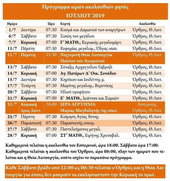 Πρόγραμμα ακολουθιών Ιουλίου 2019