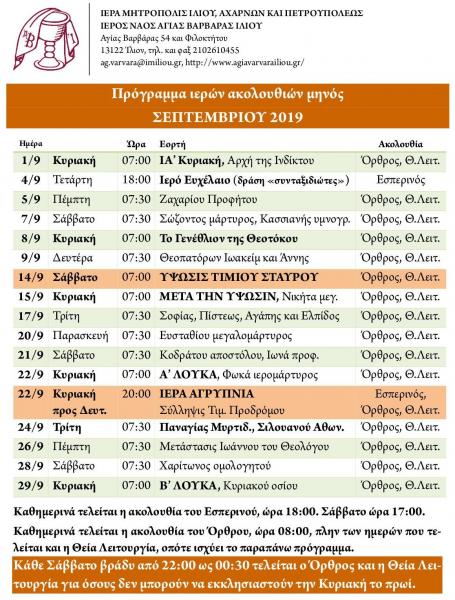 Πρόγραμμα ακολουθιών Σεπτεμβρίου 2019