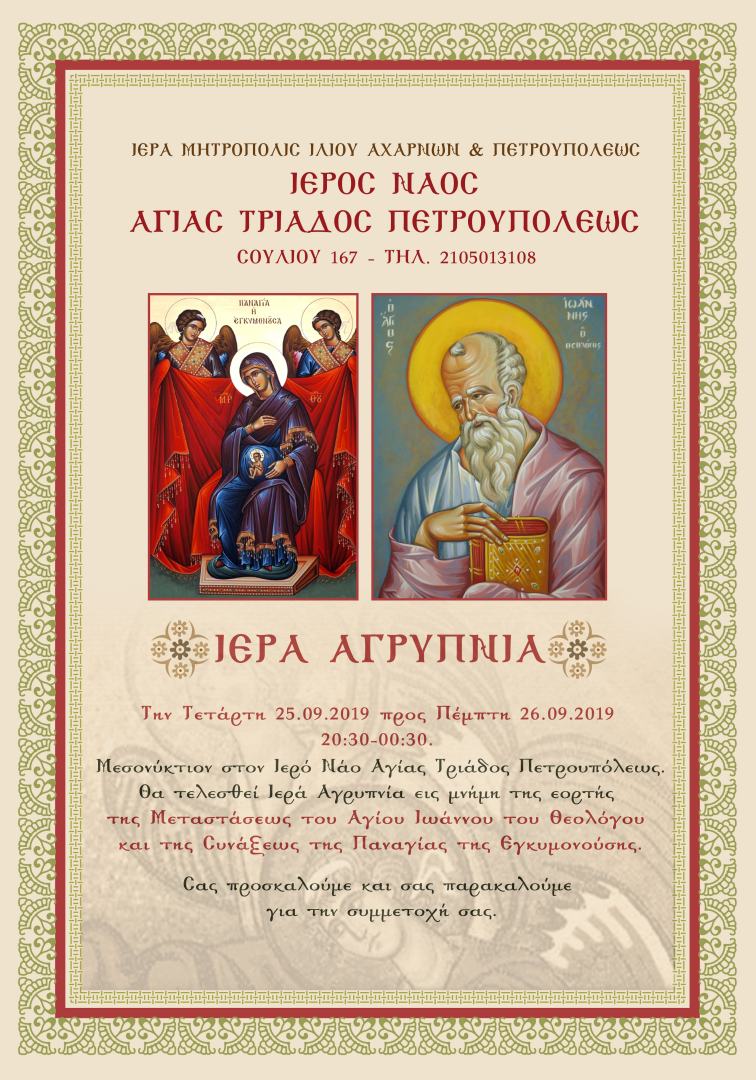 Την Τετάρτη 25/9 προς Πέμπτη 26/9/2019, από 20:30 ως 00:30, στον Ι.Ν. Αγ. Τριάδας Πετρουπόλεως θα τελεσθεί Ιερά Αγρυπνία επί τη εορτή της Μεταστάσεως του Αγίου Ιωάννου του Θεολόγου και επί τη συνάξει της Παναγίας της Εγκυμονούσης.