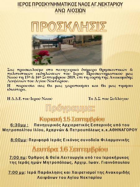 Σας προσκαλούμε στο πανηγυρικό διήμερο θρησκευτικών και πολιτιστικών εκδηλώσεων του Ιερού Προσκυνηματικού Ναού Αγ. Νεκταρίου Άνω Λιοσίων, 15 και 16 Σεπτεμβρίου 2019, επί τη εορτή της ανακομιδής των λειψάνων του Αγίου.