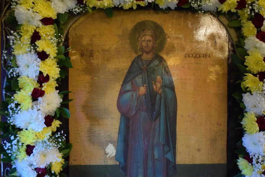Ο κ. Αθηναγόρας στο κήρυγμα του αναφέρθηκε στο βίο του Αγίου, κάνοντας ιδιαίτερη αναφορά σε δύο χαρακτηριστικά του Αγίου, που τον κατέστησαν «ηλίου λαμπρότερο», όπως αναφέρεται στο δοξαστικό των εσπεριών της εορτής. Τα χαρακτηριστικά αυτά ήταν αφενός η απλότητα της ζωής του Αγίου Σώζοντα, όπως αυτή των προβατών που βοσκούσε, και αφετέρου το θυσιαστικό του φρόνημα και το μαρτυρικό του τέλος. Χαρακτηριστικά που είχε και ο Κύριος μας Ιησούς Χριστός, από τον οποίο εμπνεύστηκε ο Άγιος.