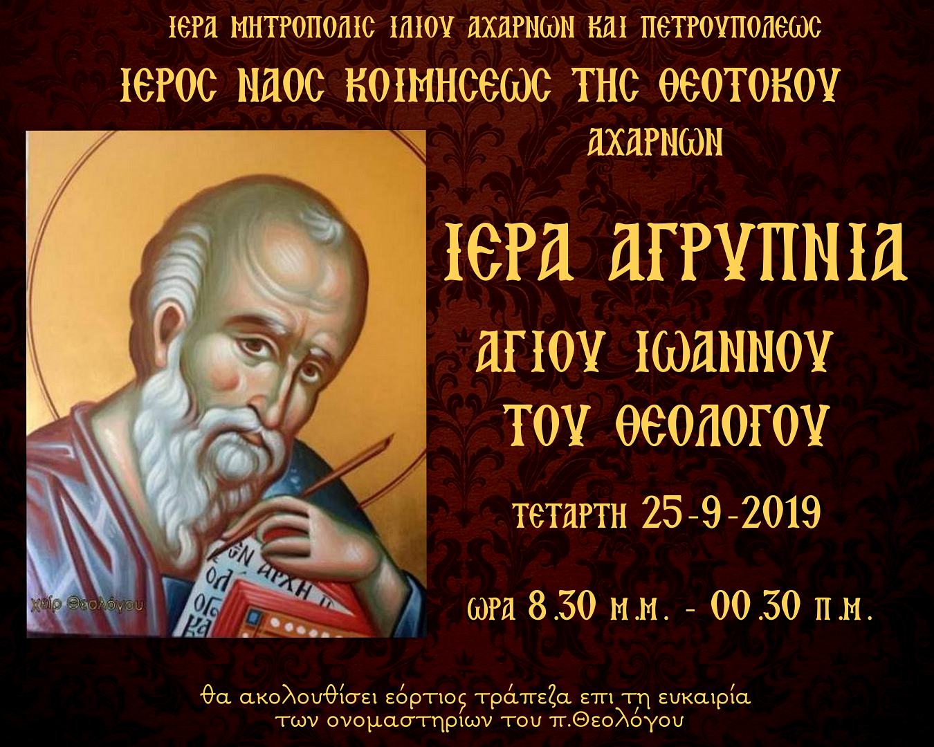 Στον Ιερό Ναό Κοιμήσεως Θεοτόκου Αχαρνών θα τελεσθεί ιερά αγρυπνία επί τη εορτή της μεταστάσεως του Αγίου Ιωάννου του Θεολόγου, την Τετάρτη 25/9/2019 και ώρα 20.30 μ.μ.- 00.30 π.μ.