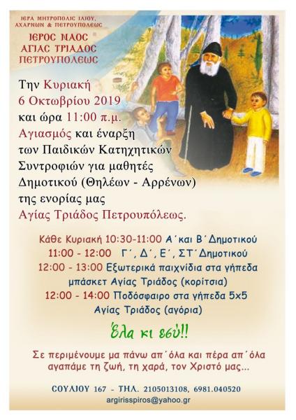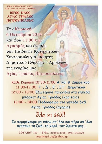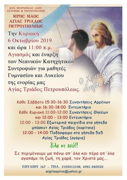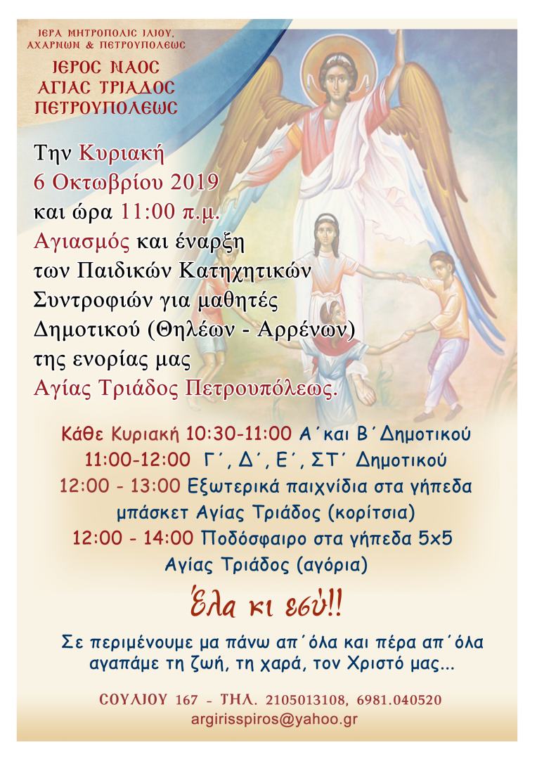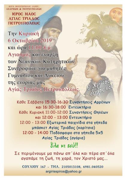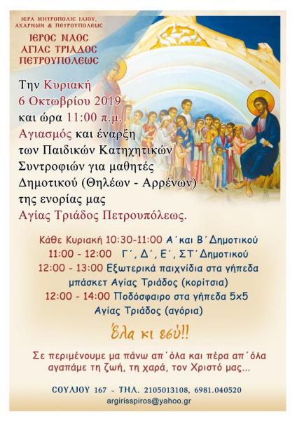 Την Κυριακή 6 Οκτωβρίου 2019, στις 11 π.μ., στο πνευματικό κέντρο του Ι.Ν. Αγ. Τριάδας Πετρουπόλεως, θα γίνει η έναρξη των κατηχητικών συνάξεων του Ι.Ν. Αγ. Τριάδας Πετρουπόλεως.