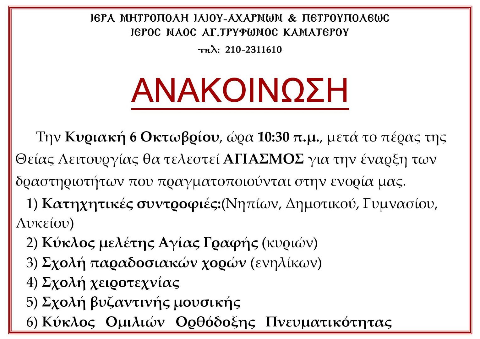 Με κατηχητικές και πολιτιστικές δραστηριότητες υποδέχεται το νέο Εκκλησιαστικό έτος η ενορία του Αγίου Τρύφωνα Καματερού.