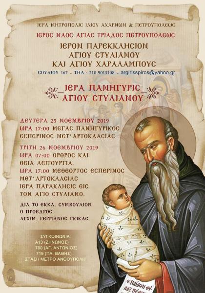 Πανηγυρίζει το παρεκκλήσιο του Αγίου Στυλιανού, το οποίο βρίσκεται στον Ιερό Ναό Αγίας Τριάδος Πετρουπόλεως.
