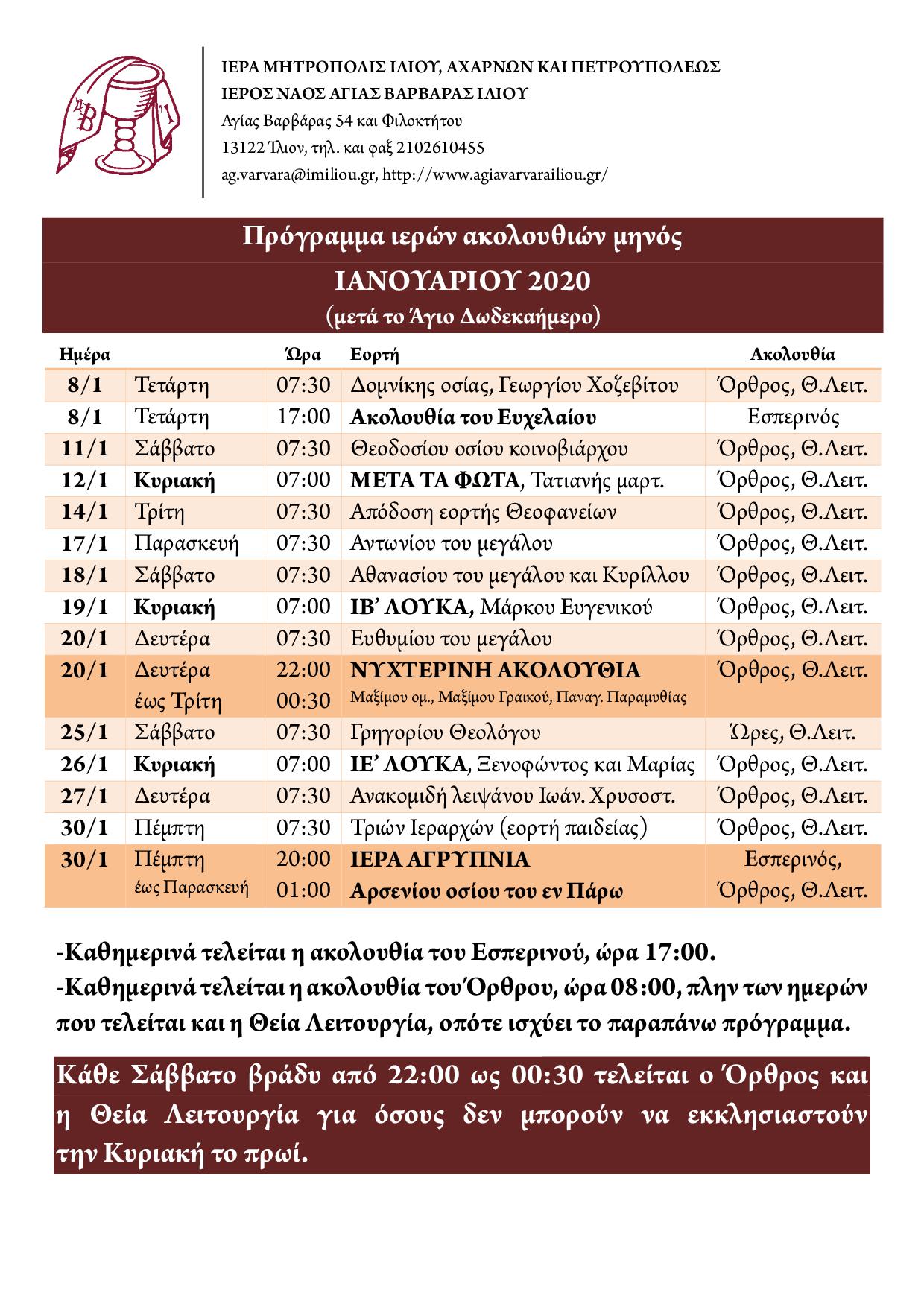 Δείτε το πρόγραμμα ακολουθιών για το μήνα Ιανουάριο 2020, στην ενορία της Αγίας Βαρβάρας Ιλίου.