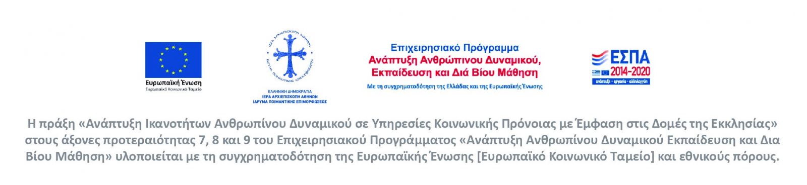 στο πλαίσιο υλοποίησης της Πράξης «Ανάπτυξη Ικανοτήτων Ανθρώπινου Δυναμικού σε Υπηρεσίες Κοινωνικής Πρόνοιας με Έμφαση στις Δομές της Εκκλησίας» (MIS 5004190) που συγχρηματοδοτείται από την Ευρωπαϊκή Ένωση (Ευρωπαϊκό Κοινωνικό Ταμείο και από εθνικούς πόρους.