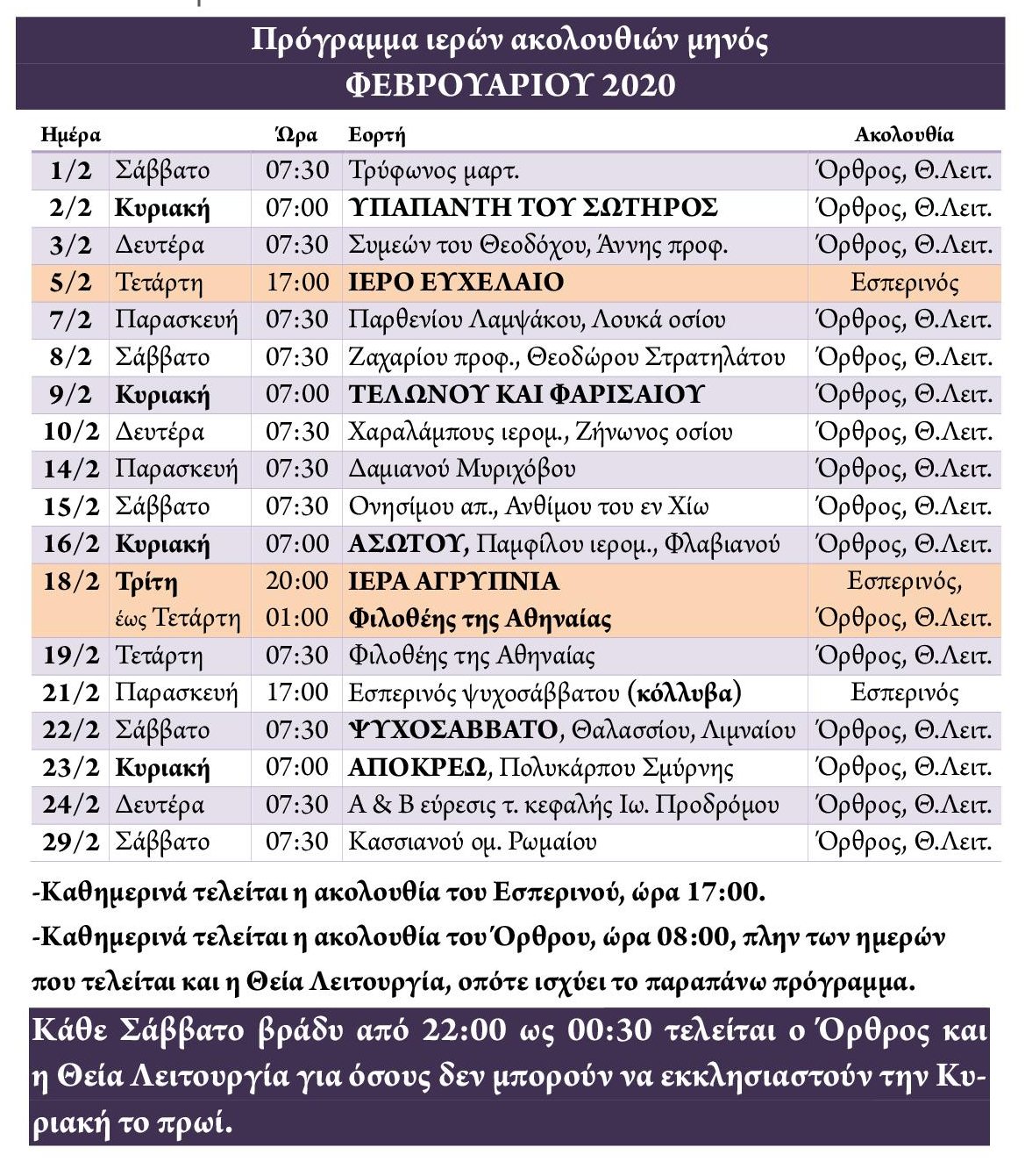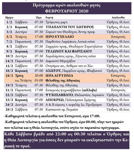 Πρόγραμμα ακολουθιών Φεβρουαρίου 2020