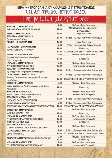 Δείτε το πρόγραμμα ακολουθιών του μηνός Μαρτίου 2020, για τον Ιερό Ναό Αγίας Τριάδας Πετρουπόλεως.