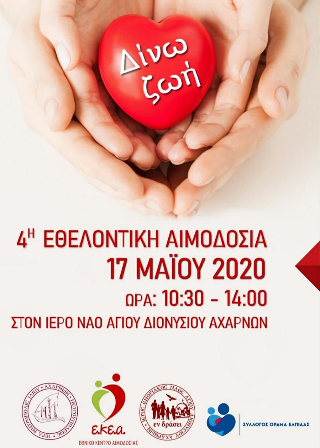 Την ημέρα κατά την οποία θα τελεστεί η πρώτη Θεία Λειτουργία με τη συμμετοχή των πιστών, μετά τη μεγάλη υγειονομική κρίση, θα πραγματοποιηθεί η 4η εθελοντική αιμοδοσία στην ενορία του Αγίου Διονυσίου Αχαρνών, σε συνεργασία με το Εθνικό Κέντρο Αιμοδοσίας και το σύλλογο «Όραμα Ελπίδας».