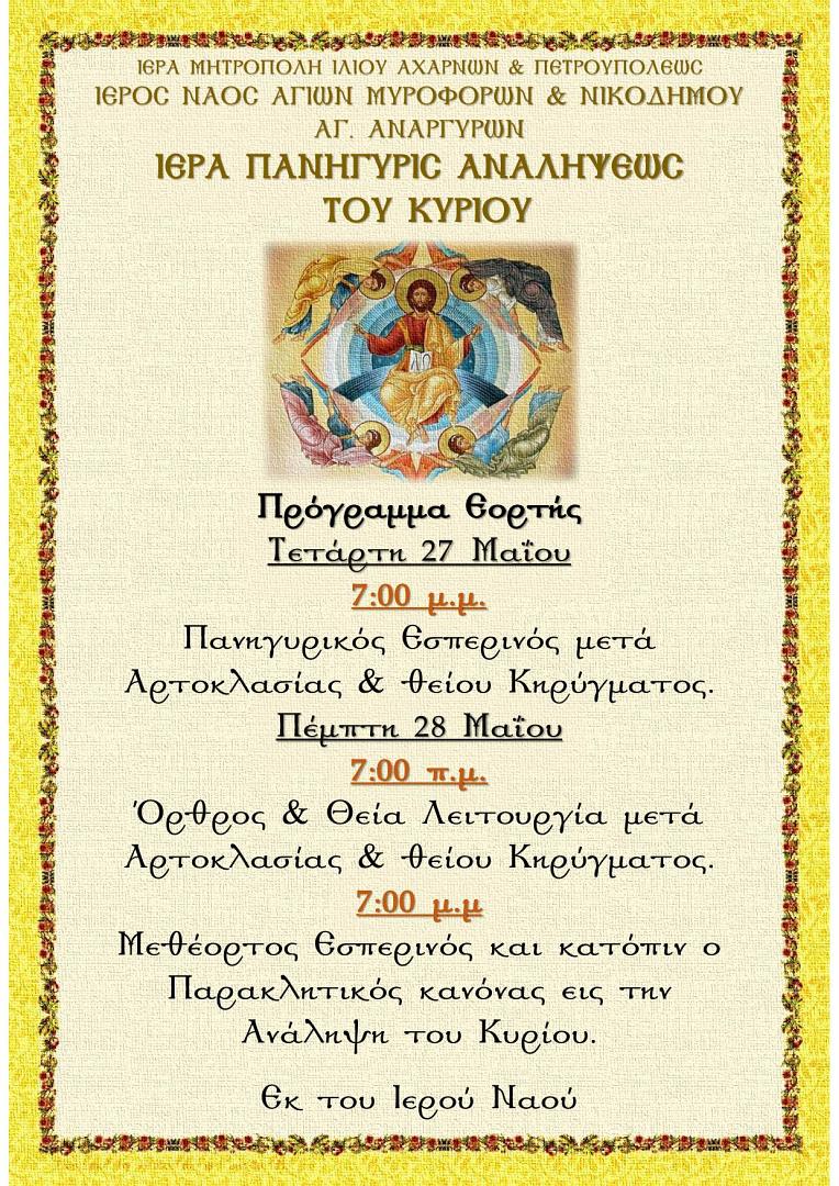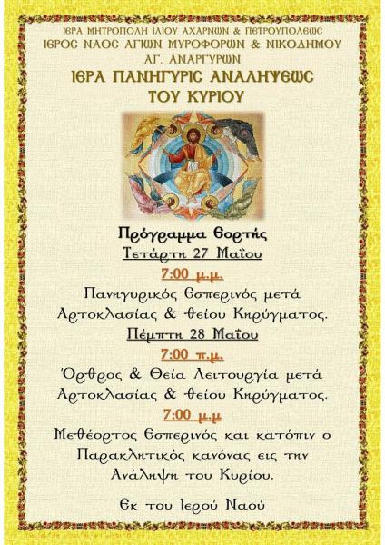 Η ενορία των Αγίων Μυροφόρων και Νικοδήμου πανηγυρίζει την δεσποτική εορτή της Αναλήψεως του Κυρίου, στις 27 και 28 Μαΐου 2020.