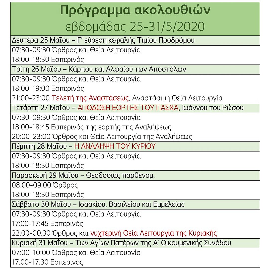 Πρόγραμμα ακολουθιών εβδομάδας 25-31/5/2020