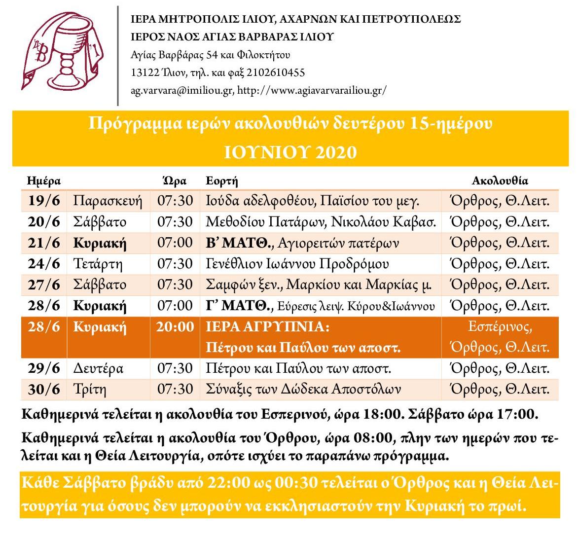 Δείτε το πρόγραμμα των ακολουθιών του Ι.Ν. Αγ. Βαρβάρας Ιλίου για το δεύτερο δεκαπενθήμερο του μήνα Ιουνίου 2020.