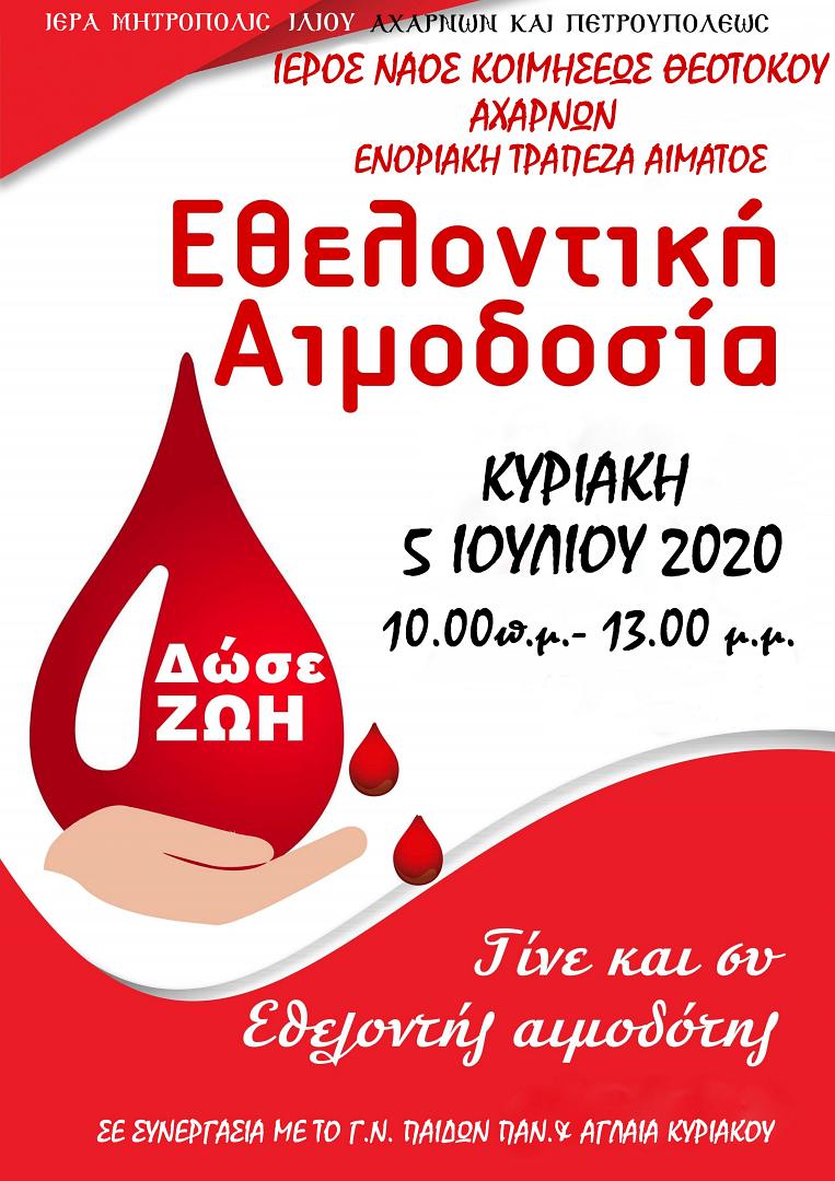 Την Κυριακή 5 Ιουλίου 2020, στον Ιερό Ναό Κοιμήσεως Θεοτόκου Αχαρνών και ώρα 10:00 έως 13:00, θα πραγματοποιηθεί Εθελοντική Αιμοδοσία για την ενίσχυση της Ενοριακής Τράπεζας Αίματος.