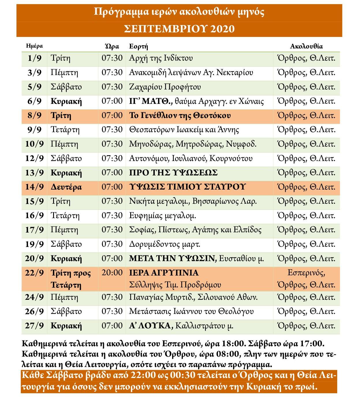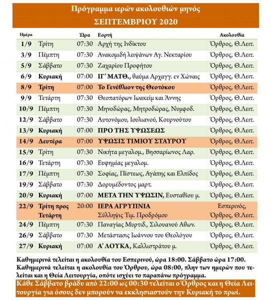 Πρόγραμμα ακολουθιών Σεπτεμβρίου 2020