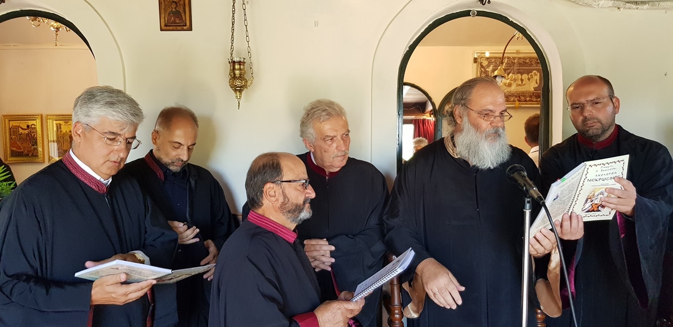 Στην εξόδιο ακολουθία, που τελέστηκε προεξάρχοντος του Σεβασμιωτάτου Μητροπολίτου Ιλίου, Αχαρνών και Πετρουπόλεως, κ. Αθηναγόρα, και τη συμμετοχή του Αρχιμ. Ιωάννου Ράπτη, προϊσταμένου του Ι.Ν. Αγ. Βλασίου Αχαρνών και του Πρωτ. Γεωργίου Γεωργακόπουλου, προϊσταμένου του Ι.Ν. Ευαγγελιστρίας Πειραιώς, έψαλλαν χοροί ιεροψαλτών υπό τη διεύθυνση του προέδρου της ΟΜΣΙΕ, πρωτοψάλτου και χοράρχη κ. Κωνσταντίνου Πολίτη και του πρωτοψάλτου του Ναού μας κ. Πανταζή Δέδε, ο οποίος και διηύθυνε τον χορό των μαθητών του εκλιπόντος.